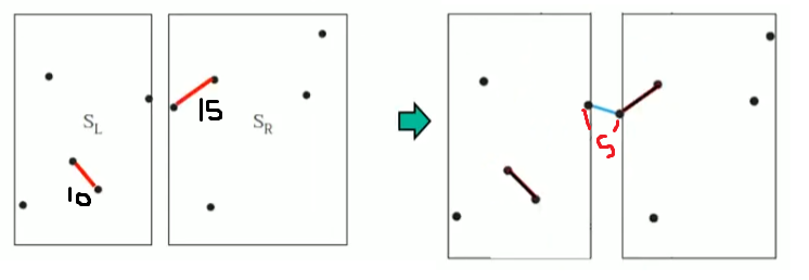 5. 왼쪽 그룹의 최근접점 쌍의 거리와 오른쪽 그룹의 최근접점 쌍의 거리를 비교해서 더 작은 쪽값이 d가 됩니다.